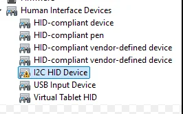 장치 관리자에 I2C HID Device라는 터치패드 관련한 디바이스 목록 앞에 삼각형 경고 표시가 들어와 있다..