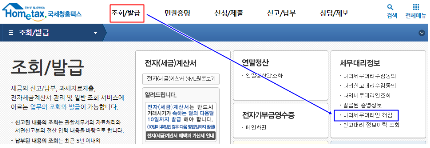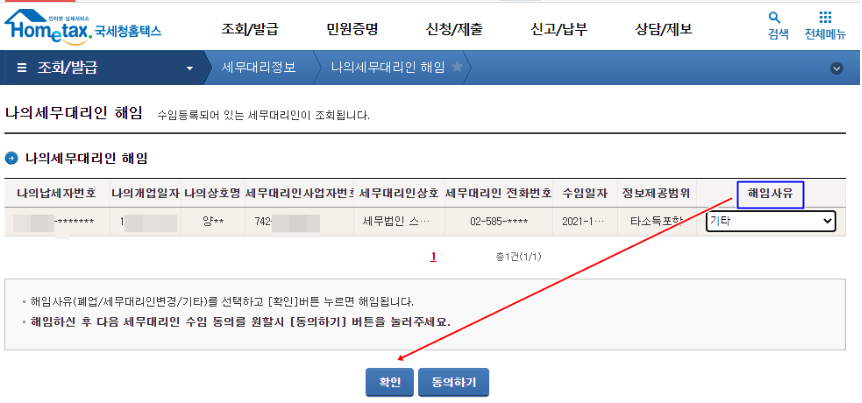 우측에 '나의 세무대리인 조회' 클릭하면,