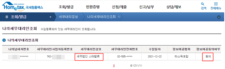세무법인 스타밸류(삼쩜삼)의 이름으로 '동의'되어 있는 것을 확인 할 수 있다..